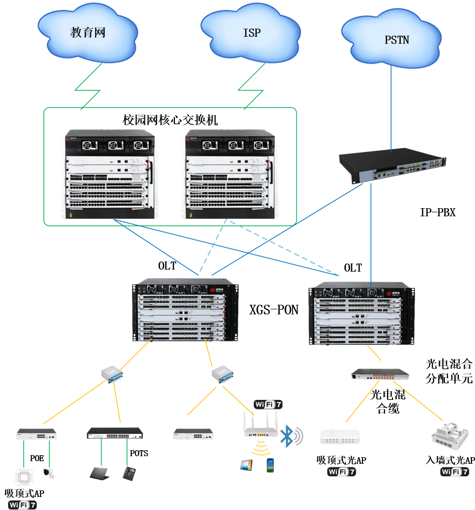 采用对称型10G-GPON(XGS-PON)技术,提供上行/下行各10Gbps带宽,满足校园高并发终端接入需求。
